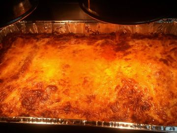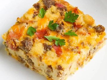 Albert's Famous Breakfast Casserole farm fresh eggs loaded with three cheeses, ham, bacon and sausage.