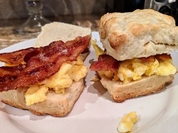 Fresh baked buttermilk biscuit with farm fresh eggs, cheese, and your choice of breakfast meat.