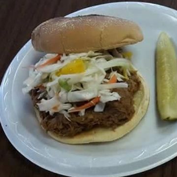 Pulled Sweet and Spicy Barbecue Beef or Pork served with choice of green beans or baked beans, rolls or buns and coleslaw.