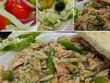 Salmon or Chicken served with orzo, asparagus, red onion, feta and capers tossed in a lemon dill vinaigrette.